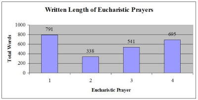 Prey Tell identifikoval ako jeden z najbežnejších prostriedkov skracovania omše používanie kratších Eucharistických modlitieb. Bol som rád, že z Corpus Christi Watershed pripojili k diskusii aj tabuľku, ktorá ukazuje dĺžku hovorenia, resp. počet slov pri jednotlivých Eucharistických modlitbách. Pôvodne pochádza z článku pátra Daniela Friela na blogu Views from the Choir Loft na CCW, ktorý mal názov Porovnávanie kánonov (graf dolu). Toto je veľmi zaujímavé a zároveň poučné. Koľkokrát ste boli na veľkej liturgickej slávnosti, ktorá by so všetkými náležitosťami trvala viac ako hodinu a pol, pričom by sa však celebrant rozhodol pre Eucharistickú modlitbu 2 alebo 3 len preto, aby omša netrvala tak dlho? Je dokázané, že pri štandardnej frekvencii 150 slov za minútu by prvá Eucharistická modlitba (rímsky kánon) trvala iba o tri minúty dlhšie než Eucharistická modlitba 2.