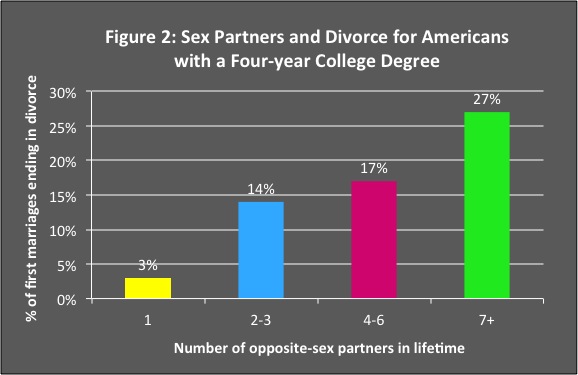 U Američanov s VŠ vzdelaním to nie je až také dramatické, no stále je to pozoruhodné. 3% respondentov sa rozviedlo v prvom manželstve ak mali iba jedného sexuálneho partnera. U dvoch až troch partnerov je to 14%, u štyroch až šiestich 17% a u sedem a viac 27%.