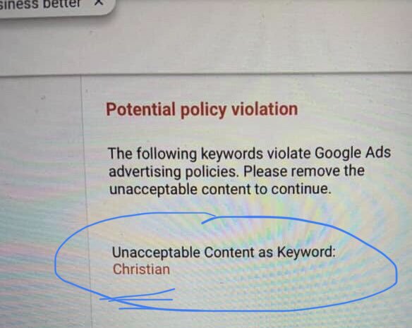 Reportáž od Faithwire opisuje snímku emailu od spoločnosti Google, ktorý bol adresovaný Robichauxovi. V tomto emaily je uvedené, že slovo "kresťan" je "neprípustným obsahom" a "potenciálnym porušením pravidiel".