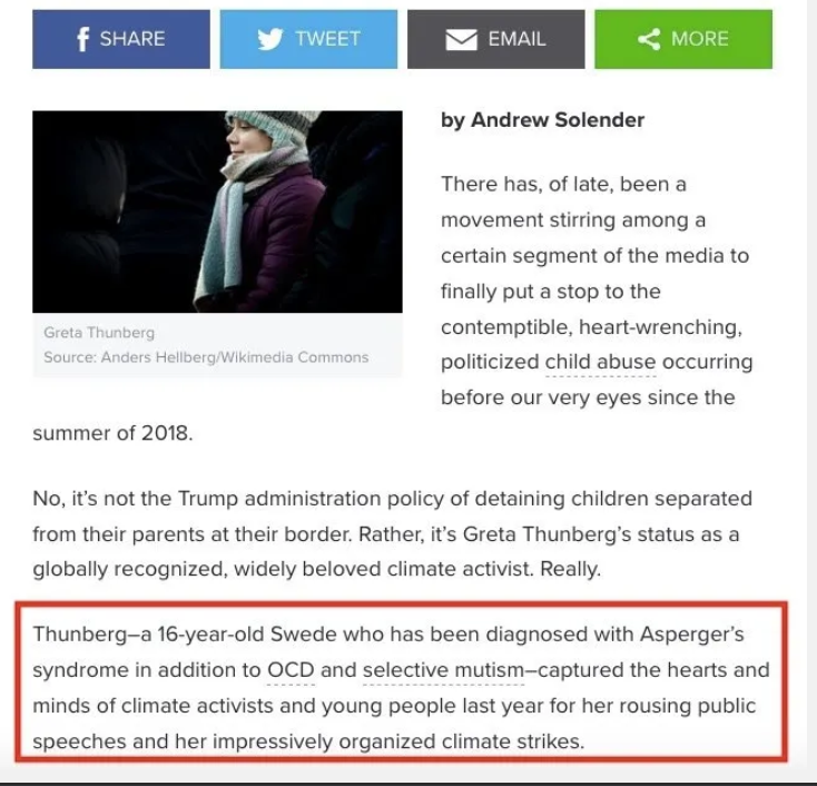 Dalo by sa pochopiť, prečo mohol byť tento opis v časopise Psychology Today problematický vzhľadom na to, že nedávno kritizovali Michaela Knowlesa z The Daily Wire, keď označil Thunbergovú za "duševne choré švédske dieťa" počas jeho nedávneho vystúpenia vo Fox News.