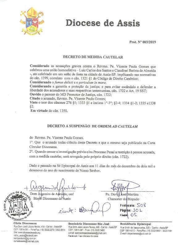 Listom, ktorý podpísal biskup Azevedo a diecézny sudca, otec David José Martins, bol otec Gomes informovaný, že má nariadený výkon preventívneho opatrenia na základe "závažných obvinení proti otcovi Vicente Paula Gomesovi, ktorý požehnal zväzok homosexuálov v meste Assis. Je suspendovaný z kňazského stavu ad cautelam (dočasne)."