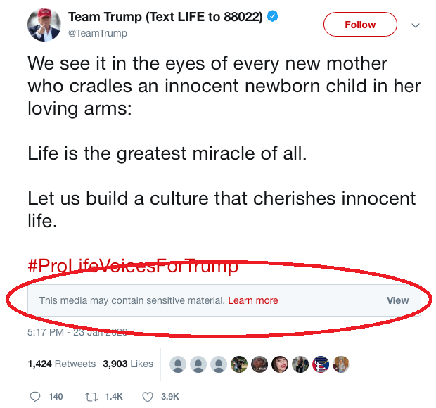 Toto video vyšlo tesne pred objavením sa Trumpa na ´Pochode za život´ v piatok vo Washingtone D.C. Ide o historicky prvú účasť prezidenta na takejto udalosti. Onedlho po tejto udalosti The Washington Free Beacon referoval, že twitter toto video už označil ´výstražným štítkom´ s varovaním, že obsahuje "citlivý materiál". Takéto štítky sú zvyčajne vyhradené pre materiál, obsahujúci násilie, nevhodné názorné ukážky a sex. Podľa smerníc twitteru je úlohou sociálnych médií snažiť sa "obmedziť zverejňovanie citlivých obrázkov a videí a brániť v šírení takýchto potenciálne rušivých typov citlivých médií."