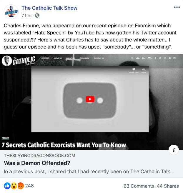 V spolitosti s nedávnym Frauneho blogom, zaoberajúcim sa týmto problémom, The Catholic Talk Show píše: "Charlesovi Fraunemu, ktorý sa objavil v našej nedávnej epizóde o exorcizme, YouTubom označenej za "nenávistný prejav", pozastavuje Twitter konto?!?! Charles o celej veci musí konštatovať jediné ... naša epizóda a jeho kniha podľa mňa ´niekoho´ alebo ´niečo´ rozčúlila alebo nahnevala."