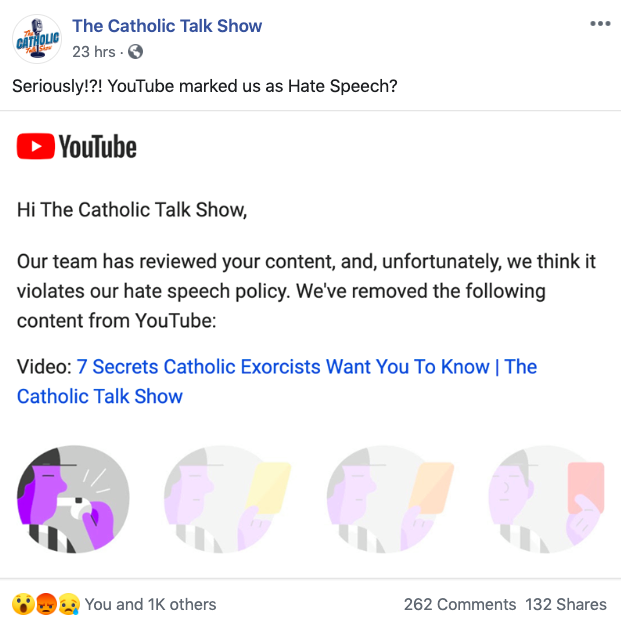 The Catholic Talk Show píše: “To vážne!?! YouTube nás označuje za tých, čo sa nenávistne prejavujú?"