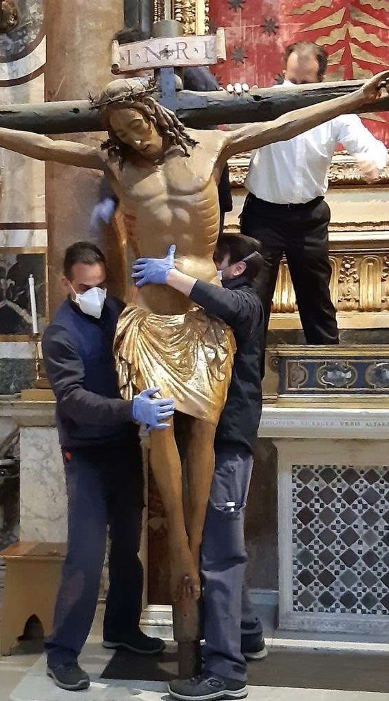 Podľa vatikánskeho žurnalistu F. Antonio Granu preniesol príslušný personál tento Kríž, ktorý sa nachádza v chráme San Marcello al Corso, v stredu večer na námestie, kde bude počas štvrtka inštalovaný.