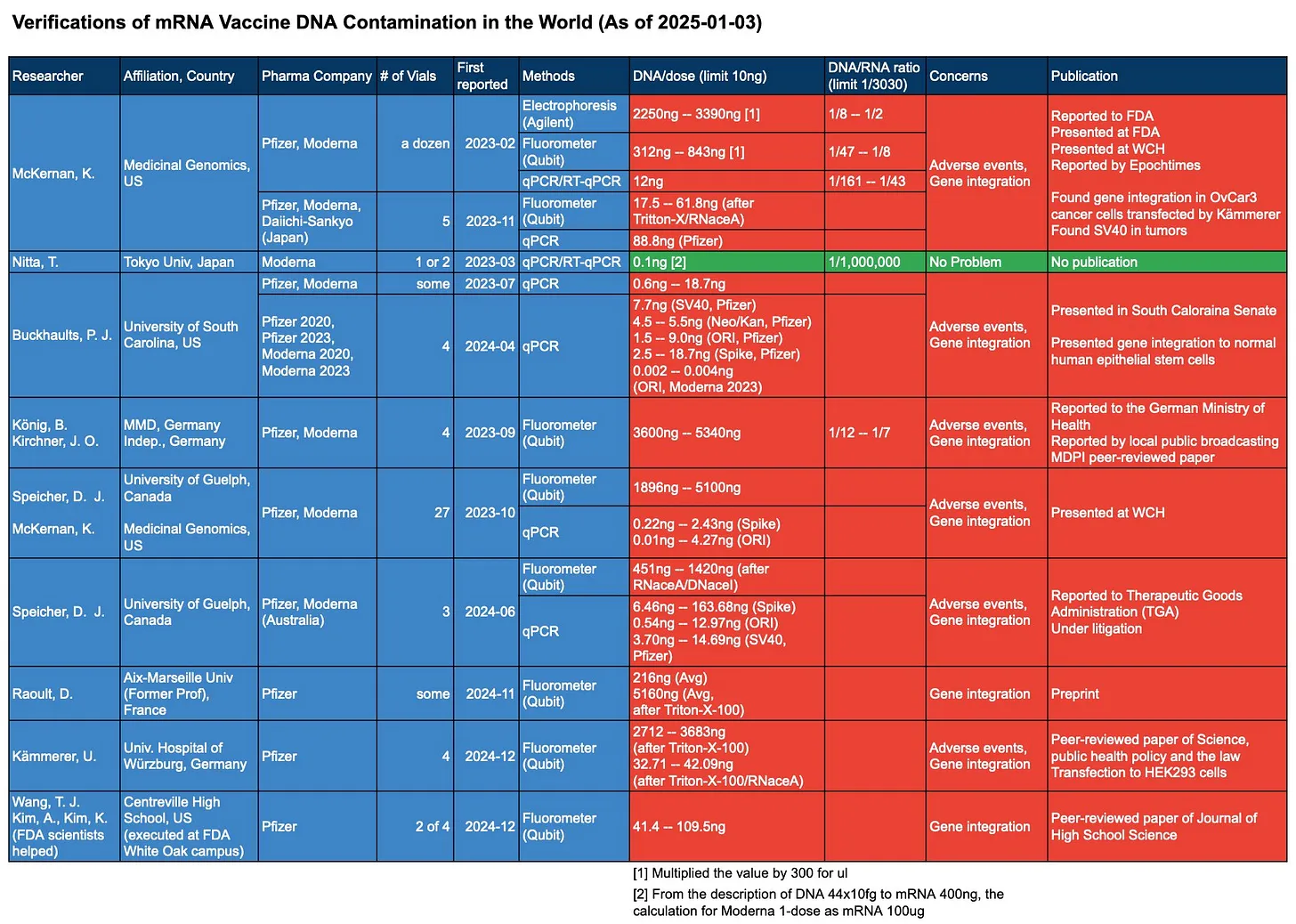 Zistenia tejto štúdie sú prekvapujúce vzhľadom na to, že vakcína Moderna’mRNA-1273 obsahuje približne trikrát viac mRNA (100 &mikro;g) ako vakcína Pfizer’BNT162b2 (30 &mikro;g). To naznačuje, že vyššia úmrtnosť pozorovaná u príjemcov vakcíny Pfizer by potenciálne mohla súvisieť s vyššou úrovňou kontaminácie DNA — problémom, ktorý bol konštantne hlásený na celom svete: