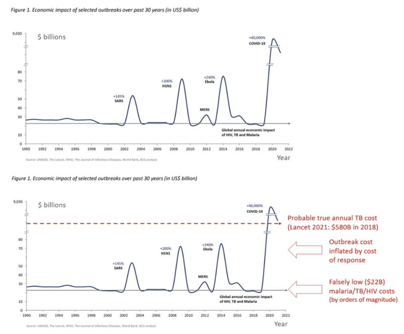 Vírus ako SARS-CoV-2 (spôsobujúci COVID-19), ktorý sa zameriava najmä na chorých starších ľudí s celkovou infekčnou úmrtnosťou približne 0,15 percenta nebude stáť 9 biliónov dolárov pokiaľ sa spanikárení alebo chamtiví ľudia nerozhodnú uzavrieť svetové zásobovacie linky, zaviesť masovú nezamestnanosť a potom vytlačiť peniaze na multibiliónové stimulačné balíčky. Naproti tomu choroby, ktoré pravidelne zabíjajú viac a oveľa mladších ľudí, ako napríklad tuberkulóza, malária a HIV/AIDS, stoja naopak oveľa viac ako 22 miliárd dolárov ročne.