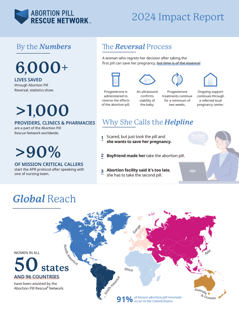 Zverejnená správa o vplyve siete APRN (Abortion Pill Reversal), ktorá bola vydaná počas nedávnej medzinárodnej konferencie 2025 Heartbeat, ukazuje, že od začiatku poskytovania služieb APR bola prostredníctvom horúcej linky poskytnutá pomoc ženám vo všetkých 50 štátoch USA a v 96 krajinách. Súčasťou siete APRN, ktorú spravuje Heartbeat International, je viac ako 1 000 poskytovateľov zdravotnej starostlivosti, kliník, lekární a organizácií poskytujúcich pomoc v tehotenstve na celom svete. Heartbeat, najväčšia sieť organizácií na pomoc v tehotenstve v USA a na celom svete, prevzala sieť od zakladateľa Dr. Georgea Delgada v roku 2018.