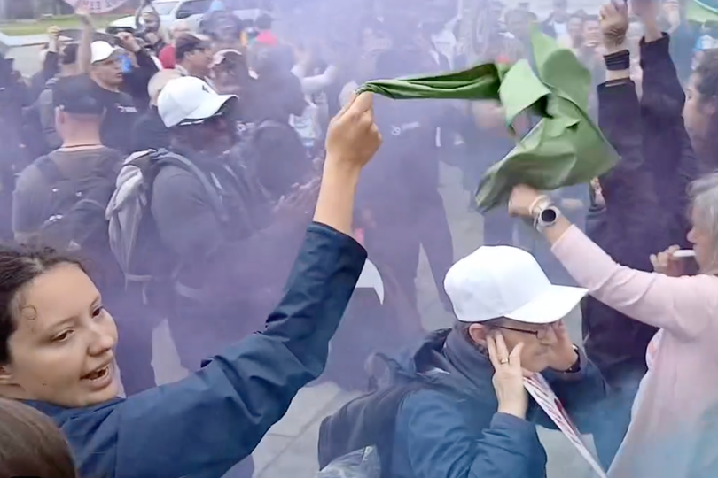 “Myslím, že to bolo vlastne vtedy, keď sme začali modlitbu, aby sme začali skutočné prejavy,” povedal Buscemi. “Vtedy’sa zbláznili. V tom momente vypukol chaos. Dymovnice praskali a všade lietal štipľavý zelenošedý dym. [Zástancovia života] museli dymovnice hádzať na druhú stranu, aby nás to úplne nezadusilo.