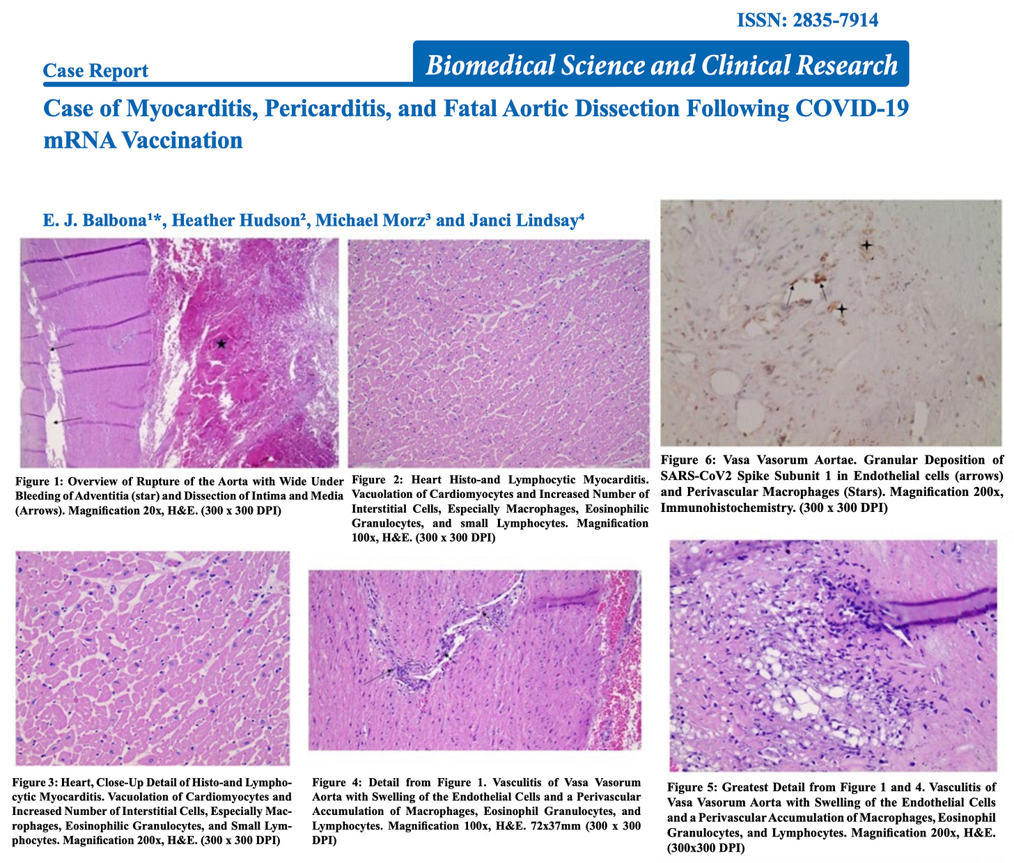 Ten článok, “Prípad myokarditídy, perikarditídy a fatálnej disekcie aorty po očkovaní mRNA COVID-19,” potvrdzuje to, čoho sa Henrietta celý čas obávala: v jeho srdci a aorte sa našiel vakcínou získaný proteín hrotov, spolu s histologickými dôkazmi eozinofilnej myokarditídy, lymfocytárnej perikarditídy a ťažkej zápalovej infiltrácie steny aorty: