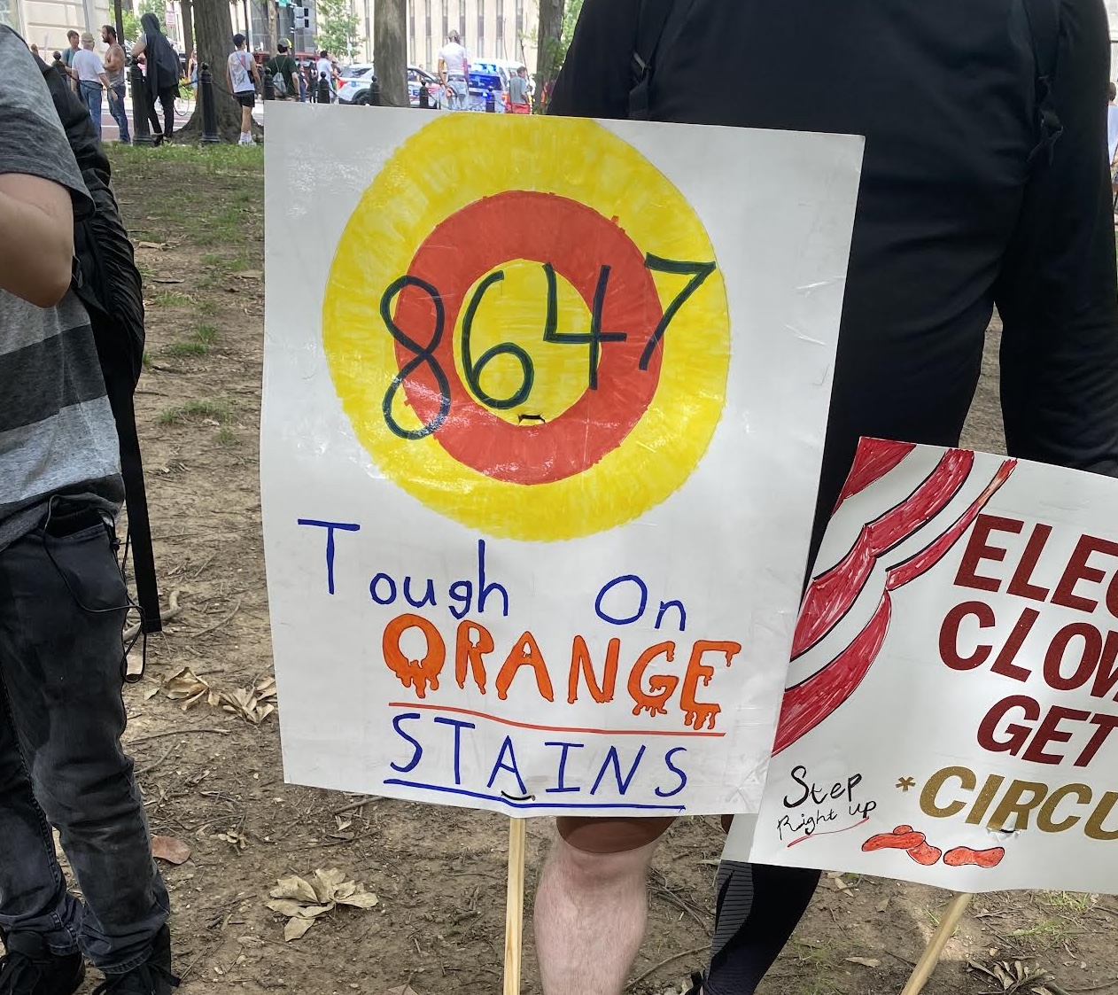 Jeden maskovaný účastník si priniesol hrubý podomácky vyrobený nápis, na ktorom bolo napísané: “8647 Tvrdo na ORANŽOVÝCH PÁCH.”