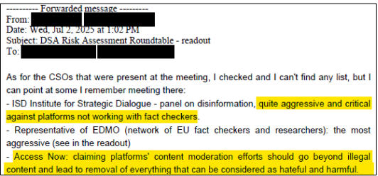 Jeden z účastníkov, Access Now, ktorý ironicky tvrdí, že obhajuje slobodu prejavu a zároveň podporuje systémy digitálnej identifikácie, poznamenal, že “všetko, čo možno považovať za nenávistné a škodlivé”, by malo byť z platforiem odstránené.