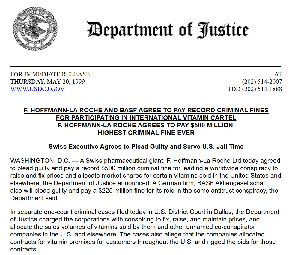 Švajčiarsky farmaceutický gigant F. Hoffmann-La Roche Ltd. dnes súhlasil s priznaním viny a zaplatením rekordnej pokuty vo výške 500 miliónov dolárov za vedenie celosvetového sprisahania s cieľom zvýšiť a stanoviť ceny a rozdeliť si podiely na trhu niektorých vitamínov predávaných v Spojených štátoch.