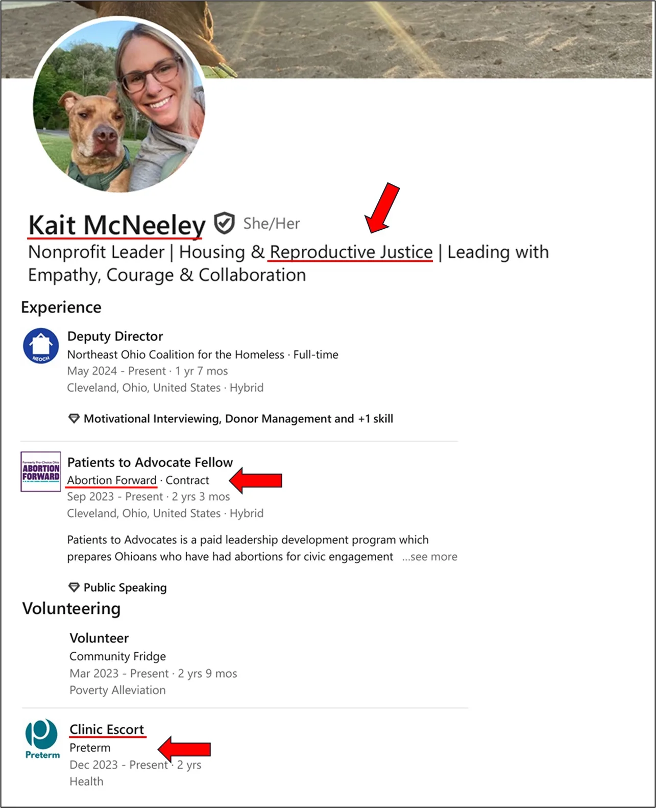V oznámení sa spomína niekoľko aspektov McNeeleyho’profesionálnej minulosti – zástupca riaditeľa Koalície pre bezdomovcov v severovýchodnom Ohiu, výkonný riaditeľ v projekte Metanoia a správca nehnuteľností v spoločnosti EDEN, Inc. – ale pohodlne zamlčala, že od septembra 2023 až do súčasnosti bola “Patients to Advocate Fellow” pre organizáciu s názvom “Abortion Forward” alebo že od decembra 2023 až do súčasnosti pracovala ako dobrovoľníčka “clinic escort” pre Preterm, čo je zariadenie vykonávajúce interrupcie.