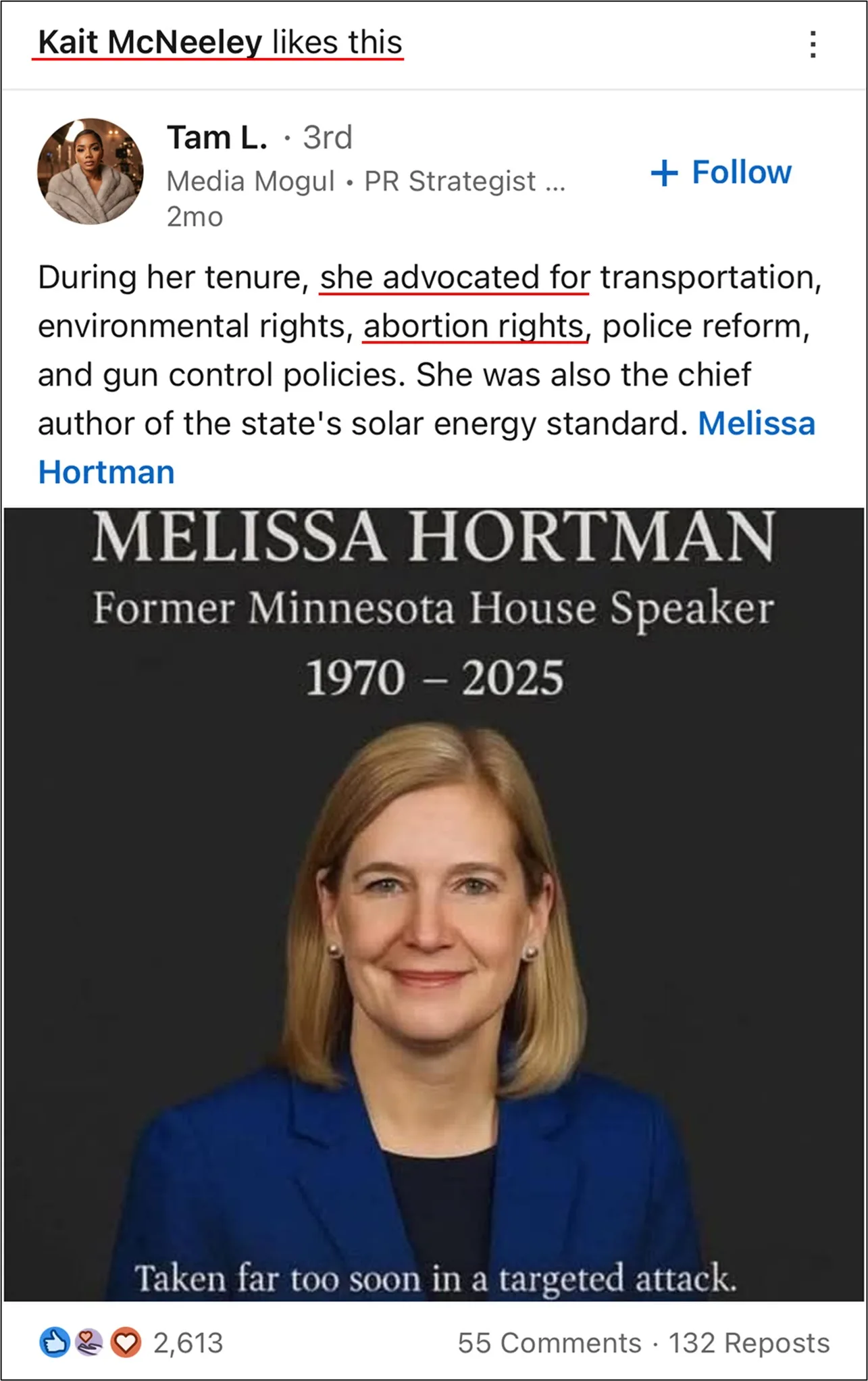 V septembri 2025 McNeeleyová lajkla príspevok oslavujúci Melissu Hortmanovú za jej obhajobu potratov.