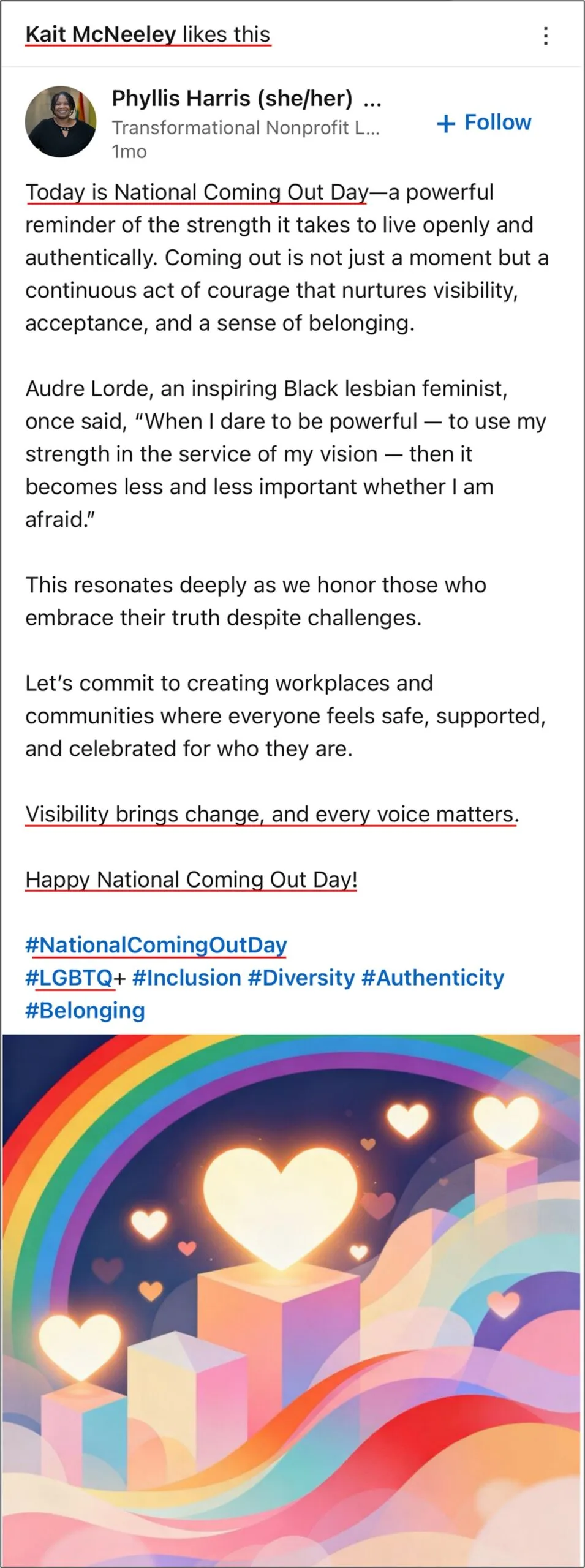 V priebehu 24 hodín od odoslania tohto e-mailu bol profil McNeeley’ovej na LinkedIn zmenený tak, že jej história práce pre potraty a LGBT ideológiu a ich podpory bola vymazaná.