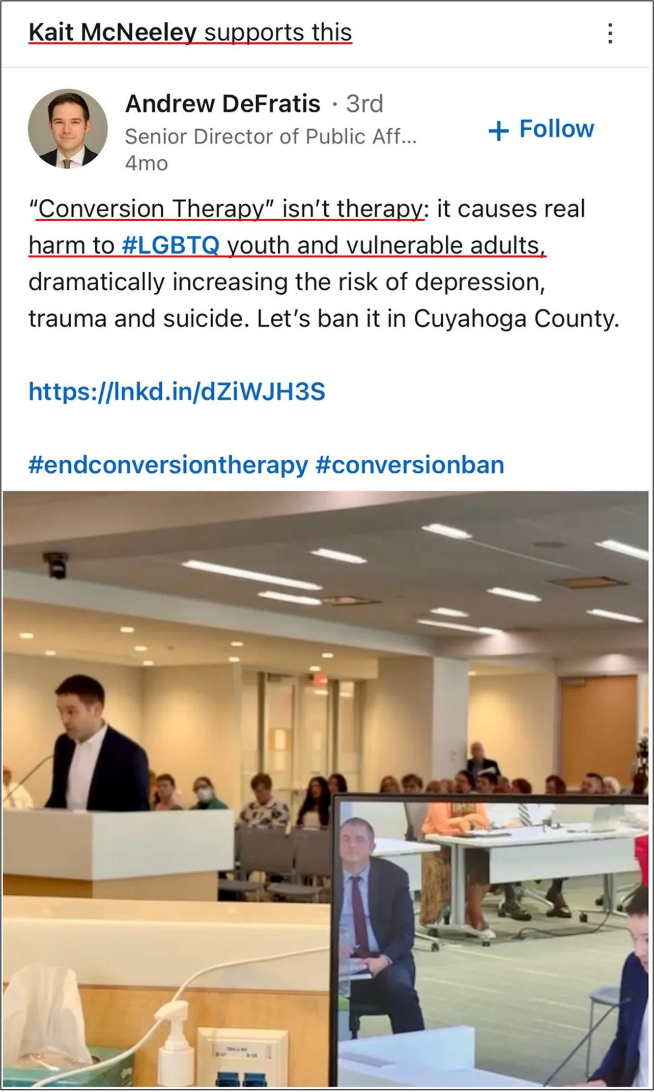Pred rokom McNeeley “miloval” príspevok koalície, ktorý vyzýval stúpencov, aby “pripojili k LGBT centru Veľkého Clevelandu” na ich “zdravotnom” podujatí, ktoré ako jedno zo svojich ustanovení konkrétne uviedlo “prístup k rodovo pozitívnej starostlivosti”.