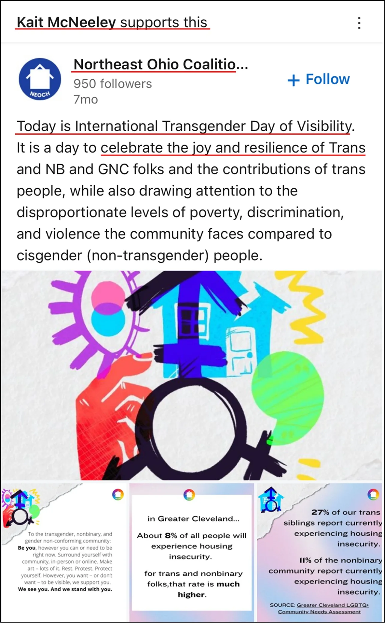 Pred siedmimi mesiacmi, keď bola zástupkyňou riaditeľa Koalície pre bezdomovcov v severovýchodnom Ohiu, “podporila” vyhlásenie koalície pri príležitosti “Dňa viditeľnosti trans ľudí.”