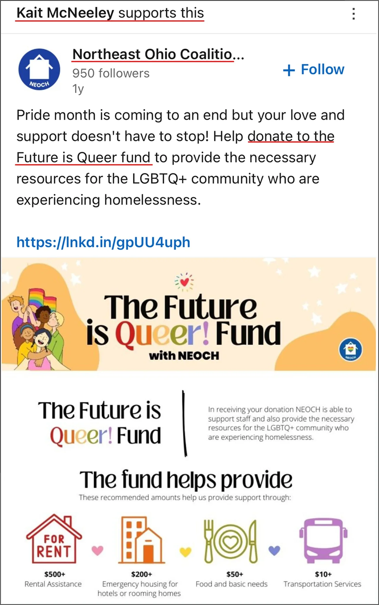 Doplnkové aktivity McNeeleyho’na profile LinkedIn zahŕňajú podporu potratov a ideológie LGBT – vrátane funkcie šéfa Koalície pre bezdomovcov v severovýchodnom Ohiu.