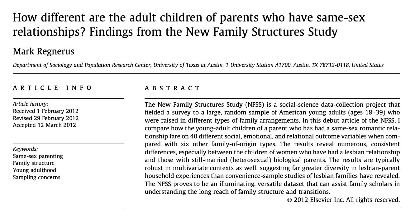 Vedci čerpali údaje z vládnych záznamov (dobré), takže účastníci neboli’informovaní o cieľoch štúdie (dobré), mali vzorku 44 (typické) a skúmali skutočné výsledky detí (dobré). Keďže išlo o jednu z mála štúdií, v ktorej sa použila zlatá štandardná metodika, približne tucet z ďalších 74 štúdií ju citovalo ako "základný dôkaz veľkej vzorky", že deti s "rodičmi" rovnakého pohlavia sa majú "rovnako dobre" ako deti s heterosexuálnymi rodičmi.