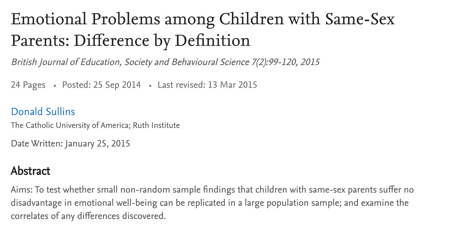 Sullins zistil aj šokujúci záver – deti Wainrightovej a Pattersonovej s “ženatými” rodičmi“rovnakého pohlavia” sa mali horšie ako deti s neženatými rodičmi“rovnakého pohlavia”:V tomto prípade to ešte viac posilnilo škody na deťoch, o ktorých toto hnutie tvrdilo, že neexistujú.