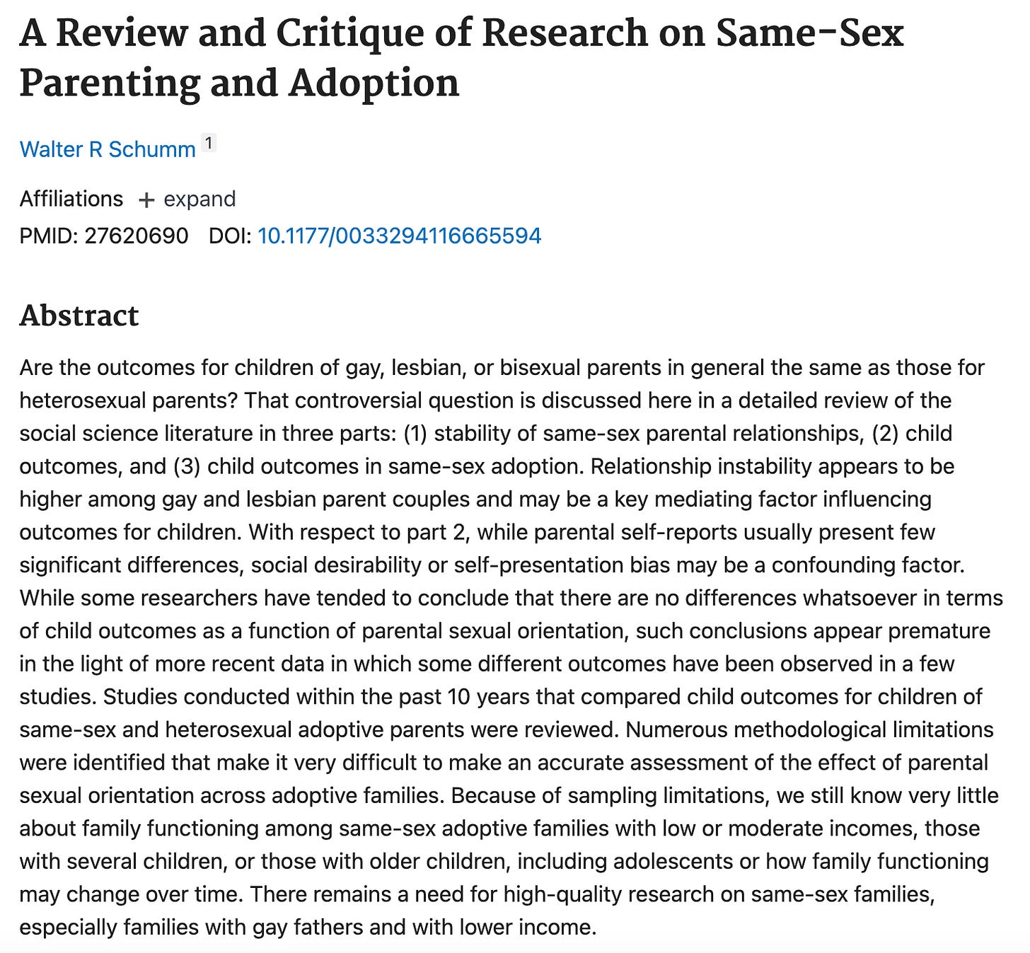 Nechcete’nám veriť na slovo? Komplexný prehľad z roku 2015, “A Review and Critique of Research on Same-Sex Parenting and Adoption,” dospela k záveru, že – vzhľadom na vysokú rodičovskú nestabilitu, obmedzené údaje o adoptovaných deťoch vychovávaných pármi rovnakého pohlavia a prevažnú závislosť od vlastných správ rodičov – tvrdenia o “žiadnych rozdieloch” sú “predčasné.” Inými slovami, ideologicky motivovaní vedci stavali mrakodrap istoty na základoch z piesku.