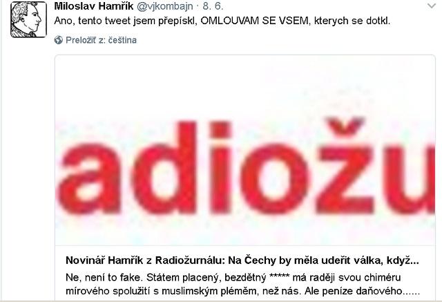 “Áno tento tweet som prepískol. Ospravedlňujem sa všetkým, ktorých sa dotkol,” napísal Hamřík na sociálnej sieti Twitter.