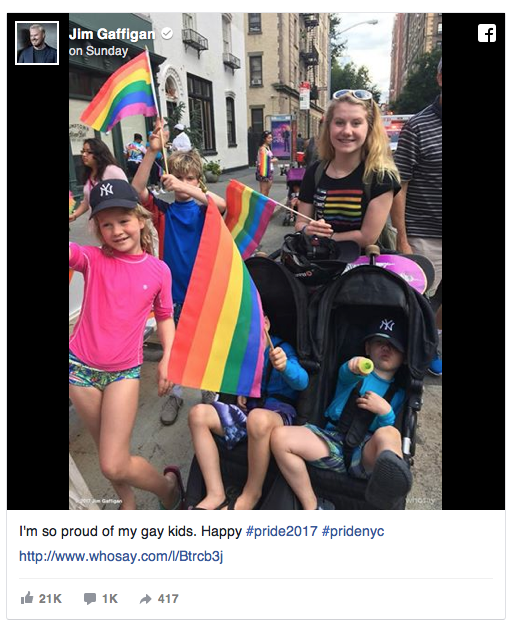 Celebritní rodičia, ako Jim Gaffigan, rýchlo poslúchnu a hrdo zverejnia fotky svojich "gay" detí na sociálnych sieťach.