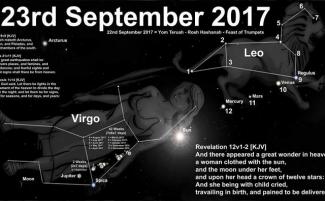Po 9 a pol mesiacoch Jupiter vystúpi z lona Panny. Po odchode Jupitera (narodenie) 23. septembra 2017 uvidíme konšteláciu Panny so slnkom priamo nad ňou (“žena odetá slnkom”). Pri nohách Panny nachádzame mesiac. A na jej hlave nájdeme korunu dvanástich hviezd, tvorenú zvyčajnými deviatimi hviezdičkami súhvezdia Leo s prídavkom planét Merkúr, Venuša a Mars.