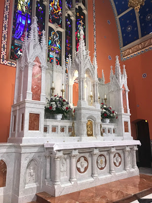 Začiatok slávenia tichej sv. omše pri novom hlavnom oltári, ktorú celebroval páter Daniel Mahoney; asistoval mu mr. Christopher Pujol; jún 2018.