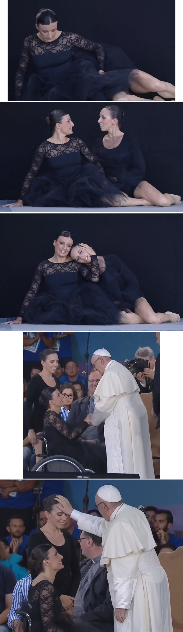 Táto ukážka predsa len mala špecifický a „vznešený“ podtón. Hlavná účinkujúca, Nicoletta Tintiová, bola rytmickou gymnastkou až do roku 2008, keď následkom zranenia chrbtice ochrnula na obidve nohy. Dnes už dokáže opäť vystupovať, ako to urobila aj pred pápežom, a to vďaka spolupráci so svojou spolutanečníčkou Silviou Bertoluzzovou.
