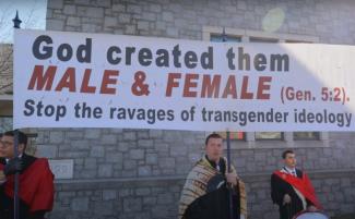 Katolíci, ktorí sa zúčastnili protestu, niesli transparenty: "Trúbte na záchranu našich detí," "Drahý Bože, nedovoľ, aby boli malé deti zvedené rozprávkami Draq Queen" a "Boh ich stvoril ako MUŽA a ŽENU".