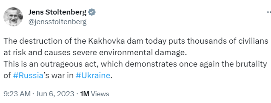 Jens Stoltenberg viedol 8. júna stretnutie s ukrajinským ministrom zahraničných vecí Dmitrijom Kulebou, aby prediskutovali výbuch, ktorý jednoznačne pripisuje Rusku. Kuleba, ktorý povedal, že stretnutie zorganizoval, už určil, kto je na vine. Ako Le Monde informuje: