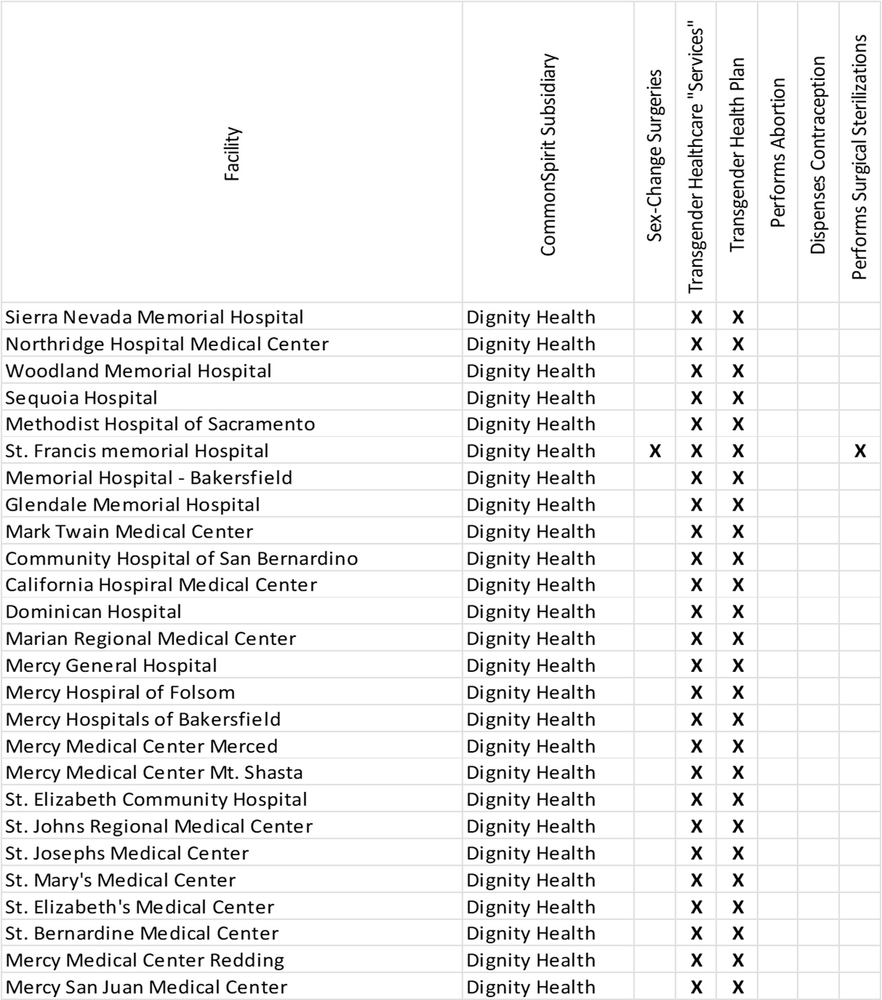 Nemocnice a zdravotnícke centrá uvedené v nasledujúcej tabuľke boli v tejto správe identifikované pre jeden alebo viacero z nasledujúcich trestných činov: vykonávanie operácií na zmenu pohlavia; poskytovanie zdravotnej starostlivosti pre transrodové osoby “služby“(či už formou odporúčaní na hormonálnu liečbu alebo poskytovania hormonálnej liečby a blokátorov puberty); poskytovanie zdravotných výhod zamestnancom, ktoré pokrývajú operácie a/alebo “služby” vykonávanie interrupcií; výdaj antikoncepcie; vykonávanie chirurgických sterilizácií.