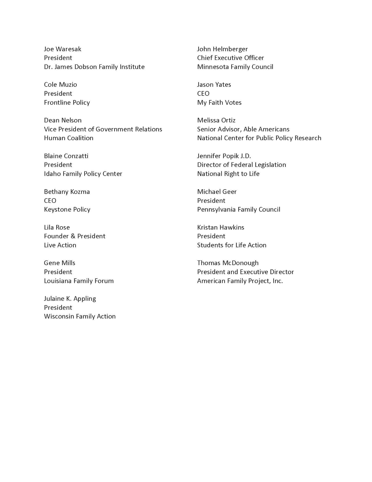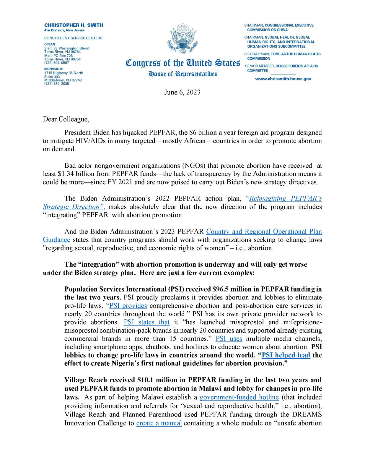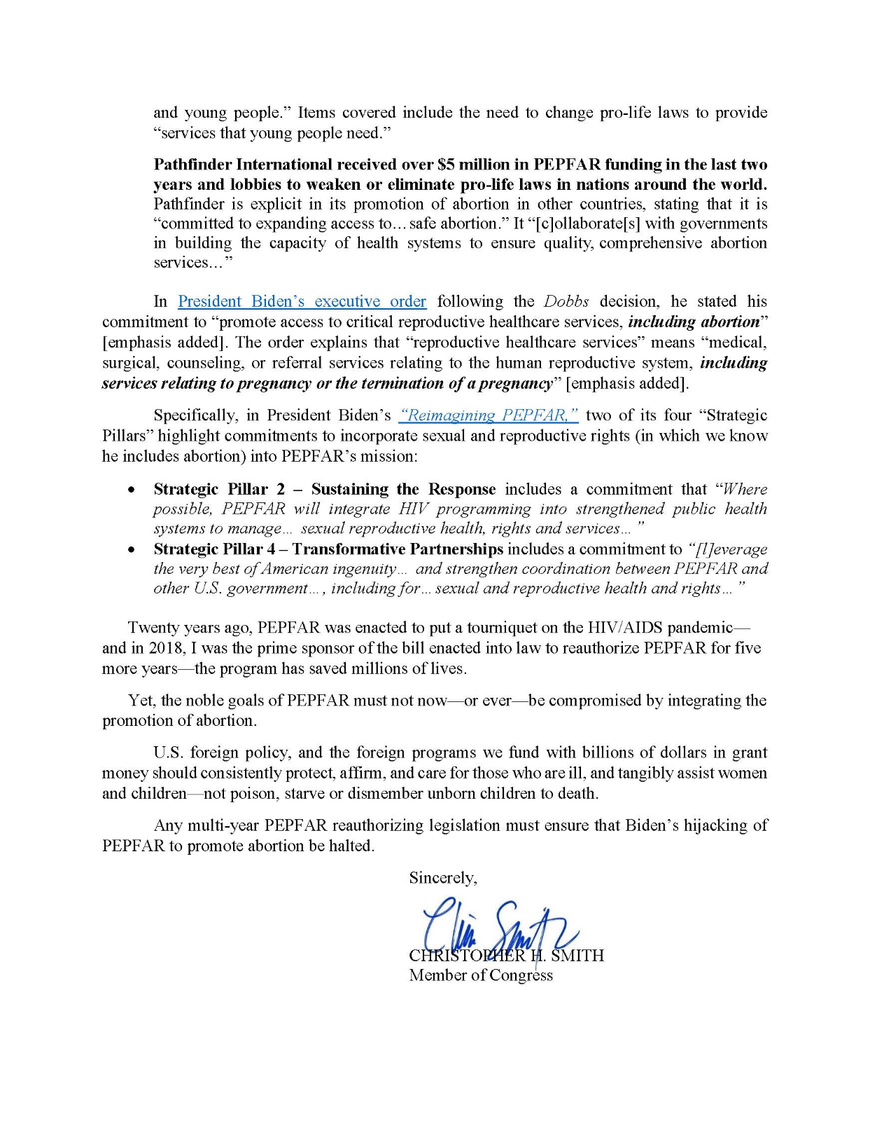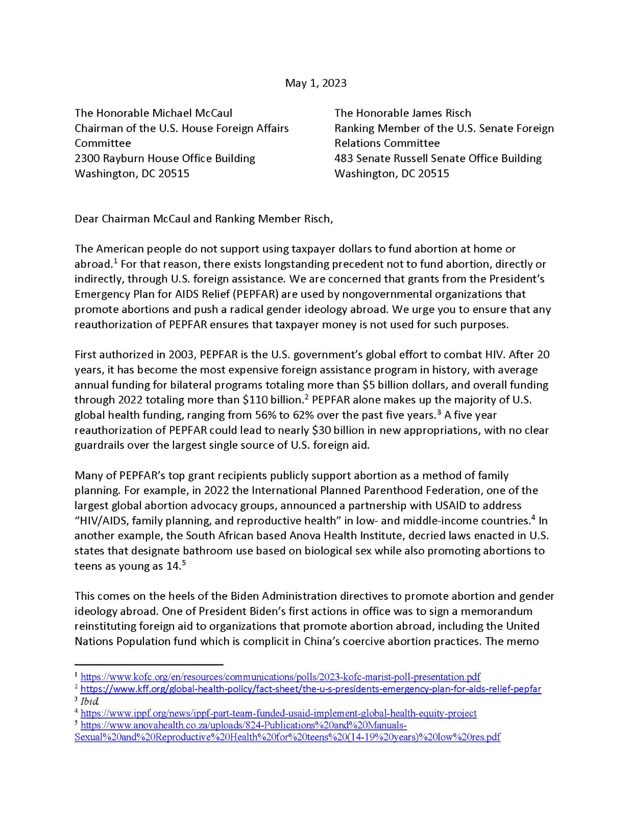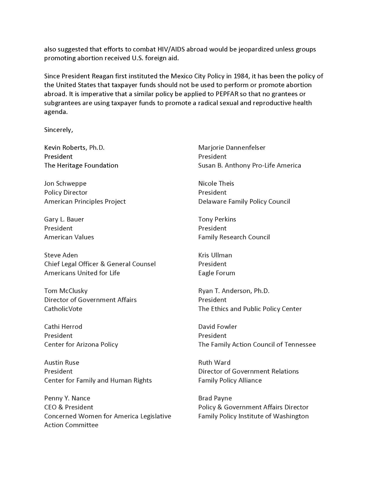 Podpísaní napísali: “Americký ľud nepodporuje používanie peňazí daňových poplatníkov na financovanie potratov doma alebo v zahraničí. Z tohto dôvodu existuje dlhodobý precedens nefinancovať potraty, priamo ani nepriamo, prostredníctvom zahraničnej pomoci USA. Sme znepokojení tým, že granty z Núdzového plánu prezidenta pre pomoc pri AIDS (PEPFAR) využívajú mimovládne organizácie, ktoré propagujú interrupcie a presadzujú radikálnu rodovú ideológiu v zahraničí. Naliehavo vás žiadame, aby ste pri každom opätovnom schválení programu PEPFAR zabezpečili, že peniaze daňových poplatníkov sa nebudú používať na takéto účely.”