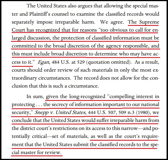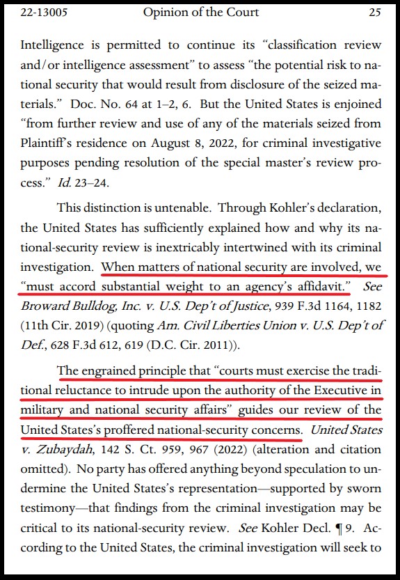 Príkaz odvolacieho súdu bol v podstate založený na tom, že ministerstvo spravodlivosti definovalo Trumpove’dokumenty z Mar-a-Lago ako “tajné” a “životne dôležité pre národnú bezpečnosť,”a súd’v stanovisku uviedol, že nemá právomoc spochybňovať rozhodnutie výkonnej moci, pokiaľ ide o to, ako DEFINOVAŤ záležitosti národnej bezpečnosti.
