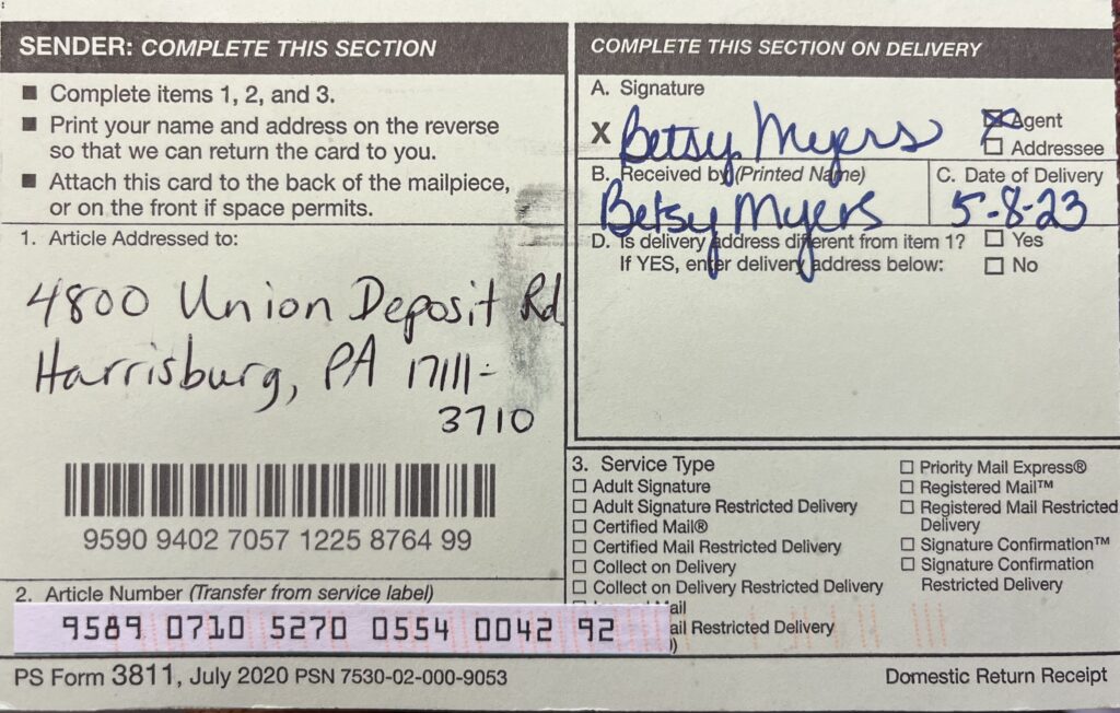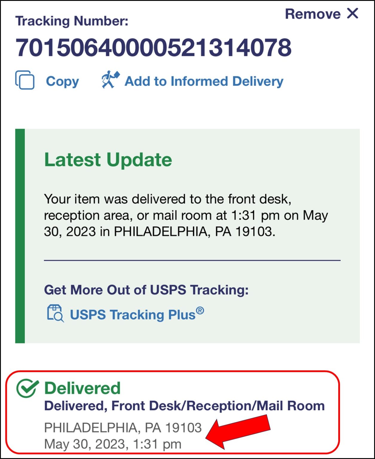 Tu je sledovací systém USPS, ktorý uvádza, že náš list bol prijatý 30. mája.