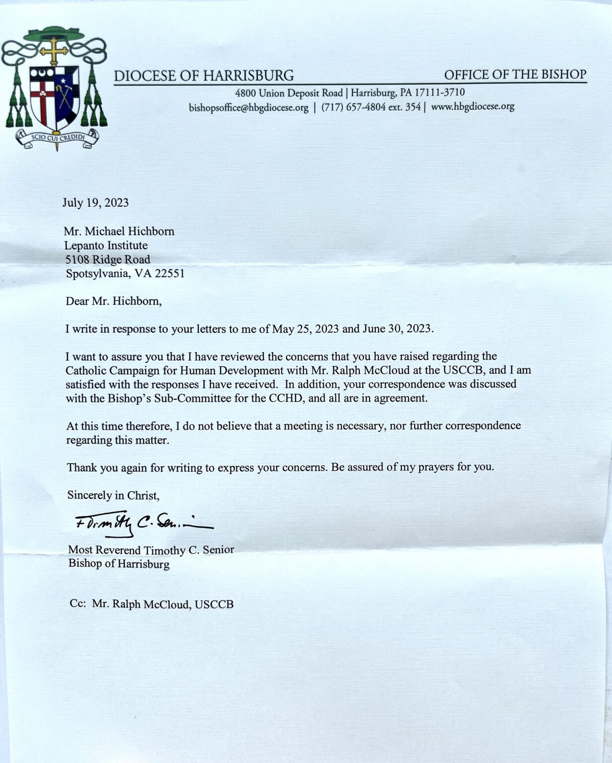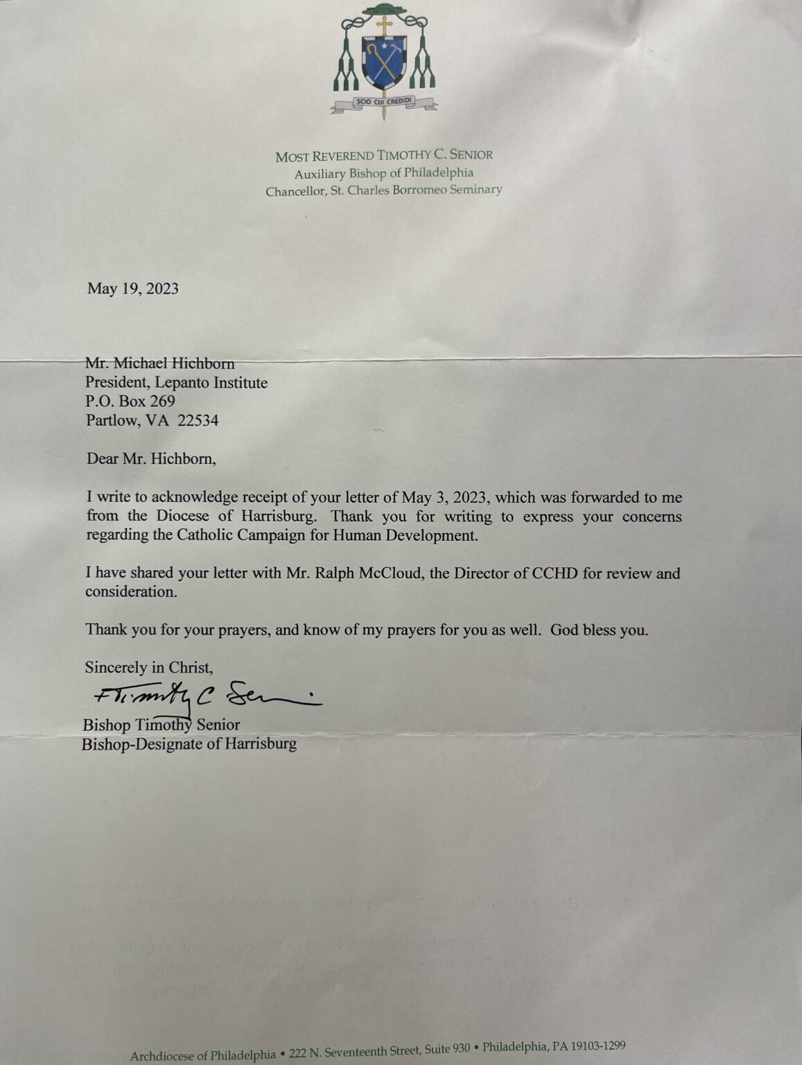 Pretože CCHD’vytrvalo odmieta odpovedať na otázky týkajúce sa správy Lepanto Institute’2022 o príjemcoch grantov CCHD a pretože CCHD odmietla zverejniť zoznam grantov na roky 2021-2022 alebo uviesť, kedy môžu veriaci katolíci očakávať jeho zverejnenie, Michael Hichborn z Lepanto Institute poslal sériu listov súčasnému predsedovi CCHD’bp. Timotejovi Seniorovi z Harrisburgu v Pensylvánii, počnúc májom. Bp Senior’v poslednom liste potvrdil, že vychvaľovaná “transparentnosť” CCHD je fraška, keď odmietol čo i len pripustiť možnosť diskusie.