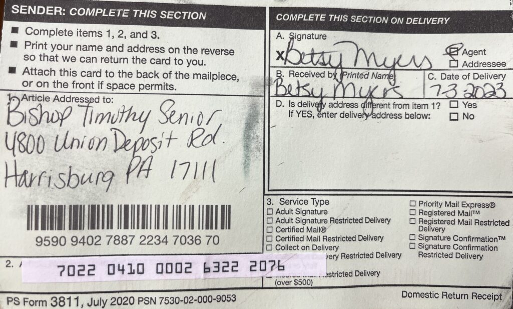 Tento list sme poslali 25. mája a na ktorý sme zatiaľ nedostali odpoveď. Všimnite si, že náš prvý list bol zaslaný diecéze Harrisburg a musel byť postúpený jeho kancelárii vo Filadelfii, pretože jeho splátka bola až 21. júna. Keďže náš list sme dostali 30. mája, adresa uvedená na jeho hlavičkovom papieri by mala byť pre neho dobrou adresou: