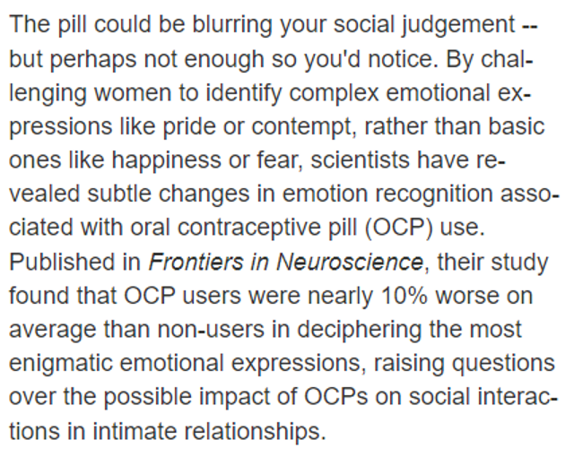 Je to súbor dôkazov, ktorý dopĺňajú štúdie, ktoré naznačujú, že orálna antikoncepcia zhoršuje schopnosť žien’rozpoznávať komplexné emócie.