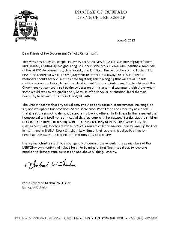 Problém v Buffalskej diecéze však siaha hlbšie a vyššie v radoch hierarchie. V reakcii na mnohé námietky, ktoré diecéza dostala v súvislosti s “prvým ročníkom Pride omše”, poslal biskup Michael Fisher všetkým duchovným diecézy list, v ktorom obhajoval omšu a znevažoval tých, ktorí mali námietky, ako osoby vynášajúce “rozsudky” a neprejavujúce “lásku.Biskup tvrdil, že omša neohrozuje katolícku náuku, hoci obhajoba životného štýlu LGBT je v jasnom rozpore s Kristovým príkazom vyzývať hriešnikov k pokániu a sv. Pavlovi’príkazom vylúčiť sexuálne nemravných z Eucharistie.
