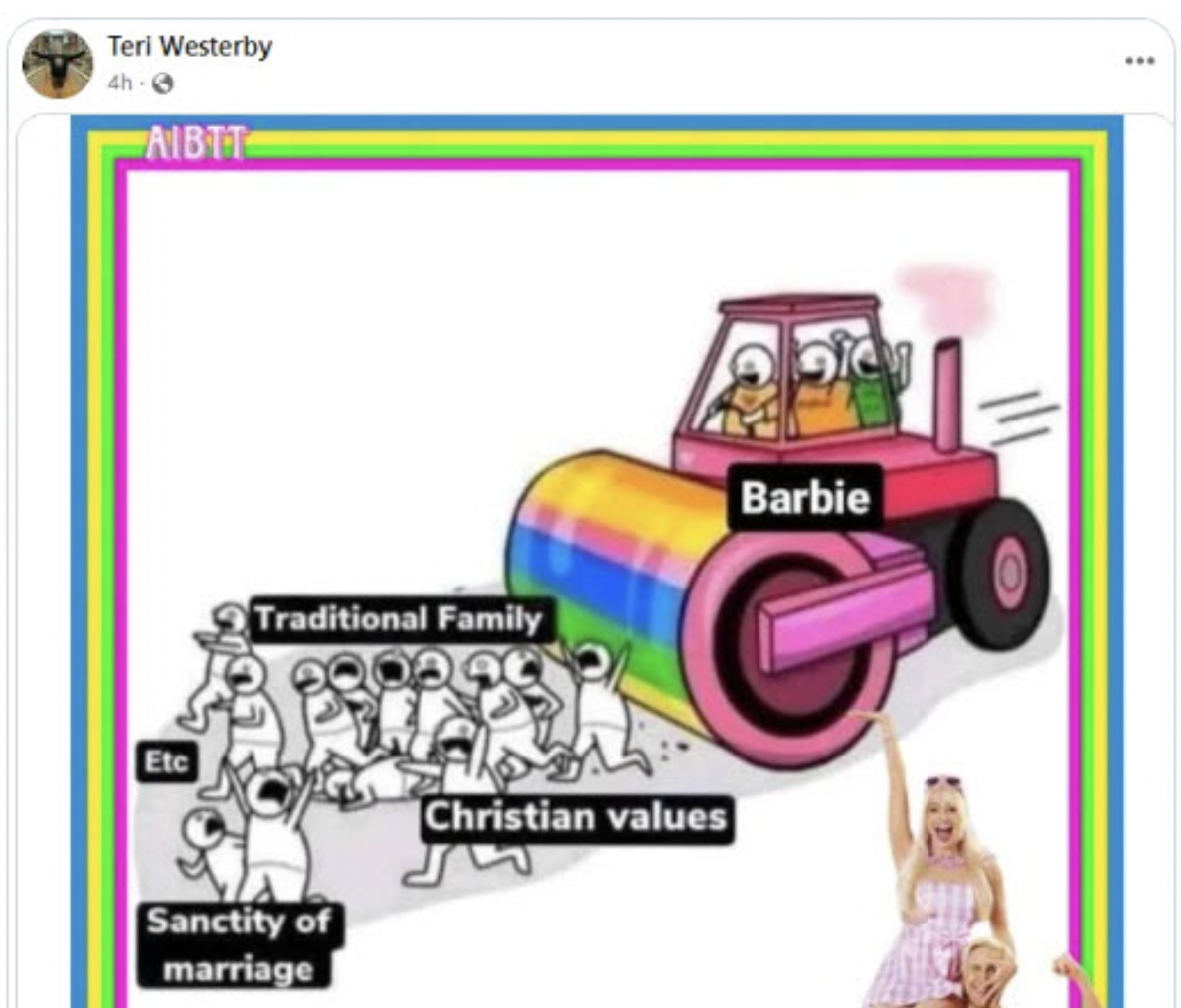 Koncom júla Westerbyová zverejnila na Facebooku meme, ktorý vyobrazoval parný valec, ktorý sa chystá skosiť skupinu terorizovaných kresťanov bežiacich o život.