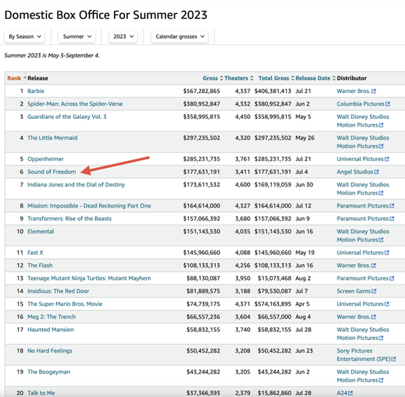 Film je naďalej prekvapivým úspechom letnej sezóny filmového priemyslu. V čase písania tohto článku zarobil film “Zvuk slobody” viac ako 175 miliónov dolárov a zaujal šieste miesto, čím porazil zamýšľané, ale nevýrazné veľkoštúdiové blockbustery “Indiana Jones” (Walt Disney Studios), “Mission Impossible” a “Transformers” (oba Paramount Pictures).