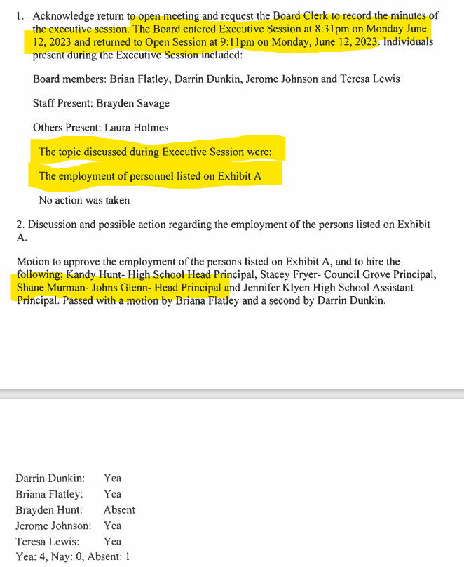 V štýle aktivistických školských rád v celej krajine a mimo typického postupu pre Western Heights sa školská rada Western Heights rozhodla vstúpiť na “výkonné zasadnutie”mimo očí verejnosti, aby prediskutovala Murnanovu”várku nových zamestnancov. Zápisnica z tejto časti zasadnutia rady z 12. júna 2023 ukazuje, že členovia rady Brian Flatley, Darrin Dunkin, Jerome Johnson a Teresa Lewis spolu so superintendentom Braydenom Savageom a právničkou Laurou Holmesovou strávili 40 minút na výkonnom zasadnutí bezprostredne pred tým, ako sa vrátili, aby verejne hlasovali o schválení prijatia Murnana. V poznámkach o ich neverejnej diskusii sa ako prerokúvaná téma uvádza len “Zamestnávanie osôb uvedených v prílohe A”