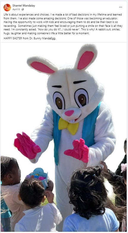 V rámci sociálnych médií aj v súvislosti so svojimi vystúpeniami pre dospelých mimo školy Murnan pravidelne spája svoju drag persónu Mandalay s úlohou pedagóga vo verejnej škole. Around Easter, he verejne zverejnil na svojej stránke drag queen’na Facebooku nasledujúce informácie o svojich predchádzajúcich zlých rozhodnutiach, o tom, že je pedagóg a hrá “Dr. Bunny MandaEgg” pre deti na základnej škole Prairie Queen.