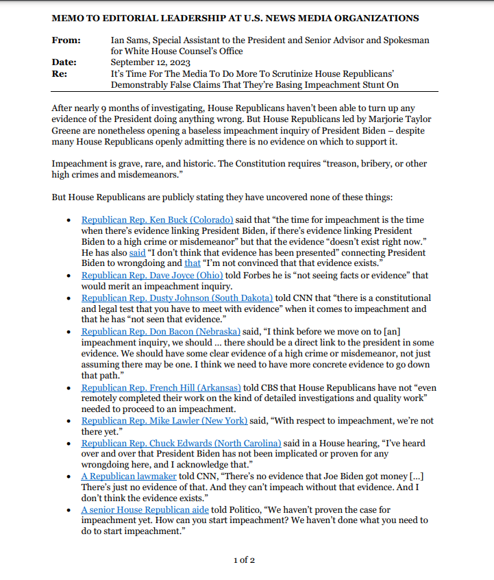 Autor listu Ian Sams je osobitným asistentom prezidenta a starším poradcom kancelárie poradcu Bieleho domu’. Nalieha na spravodajské organizácie, aby zvýšili kontrolu krokov Snemovne reprezentantov’a obviňuje ich zo začatia konania na základe nepravdivých informácií.