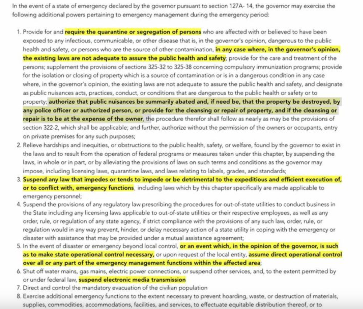 Statút o mimoriadnych udalostiach tiež umožňuje vláde ničiť majetok; pozastaviť platnosť akéhokoľvek zákona “škodlivého pre rýchly a účinný výkon “mimoriadnych funkcií;” a uvalenie karantény na každého, o kom sa predpokladá, že bol vystavený akejkoľvek infekčnej”chorobe alebo kto je “zdrojom inej nákazy.”