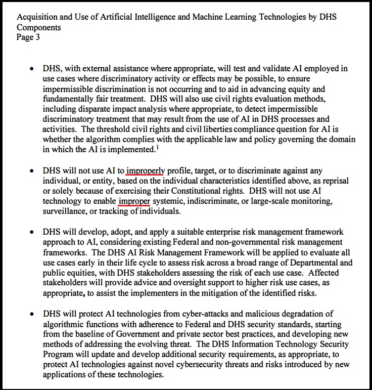 Vynechajte slovo “nevhodný” a priznanie je: DHS používa umelú inteligenciu na profilovanie, cielenie a diskrimináciu. V druhej vete: DHS sa v súčasnosti podieľa na systémovom, nediskriminačnom a/alebo rozsiahlom monitorovaní, sledovaní alebo sledovaní osôb. Jediné, čo tieto vety v odseku hovoria, je, že DHS nedovolí, aby AI vytvárala nevhodné výsledky v rámci systému, ktorý už existuje.