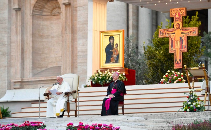 Pápež František sa dnes pred Bazilikou svätého Petra spojil s mužskými a ženskými náboženskými predstaviteľmi, aby viedol ekumenickú modlitbovú vigíliu za synodu o synodalite.