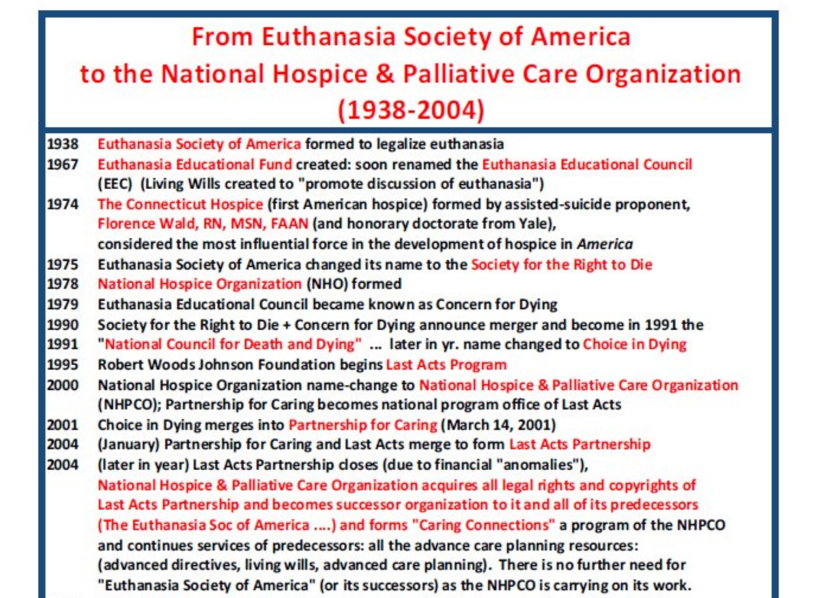 V skutočnosti je podľa Panzera veľká časť moderného amerického hospicového hnutia v podstate výhonkom hnutia za eutanáziu. Panzer pre LifeSiteNews zdôraznil, že National Hospice & Palliative Care Organization je nástupcom Choice in Dying, ktorá bola zasa pokračovateľom Eutanazijná spoločnosť Ameriky.Spoločnosť Choice in Dying zlúčil Dr. Ira Byock do skupiny s názvom Partnership for Caring, ktorá sa neskôr premenovala na Last Acts Partnership.